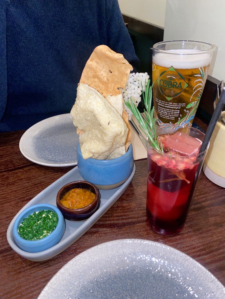 I don’t know how normal this is but the poppadoms and pickle tray at the start of an Indian meal are actually one of my favourite parts and something I look forward to so much and something that can be really disappointing if it’s not good, so I was probably too excited for them to arrive at the table! I absolutely love it when you get assorted poppadoms like the ones below and they were still slightly warm and really well made. The pickle tray consisted of Amba Kolambi Pickle and Achari Raita which were both delicious – my bf and I were practically fighting over it all.